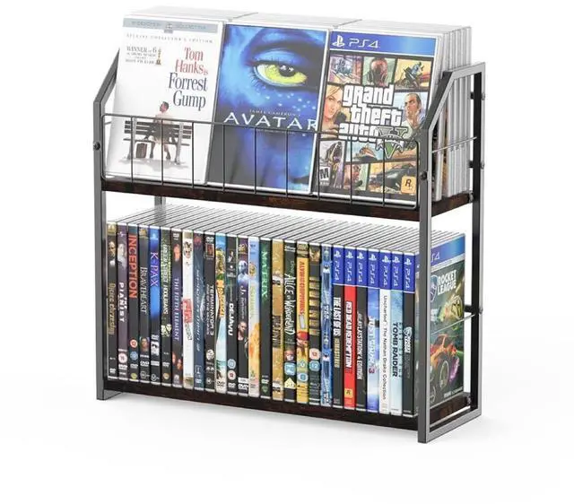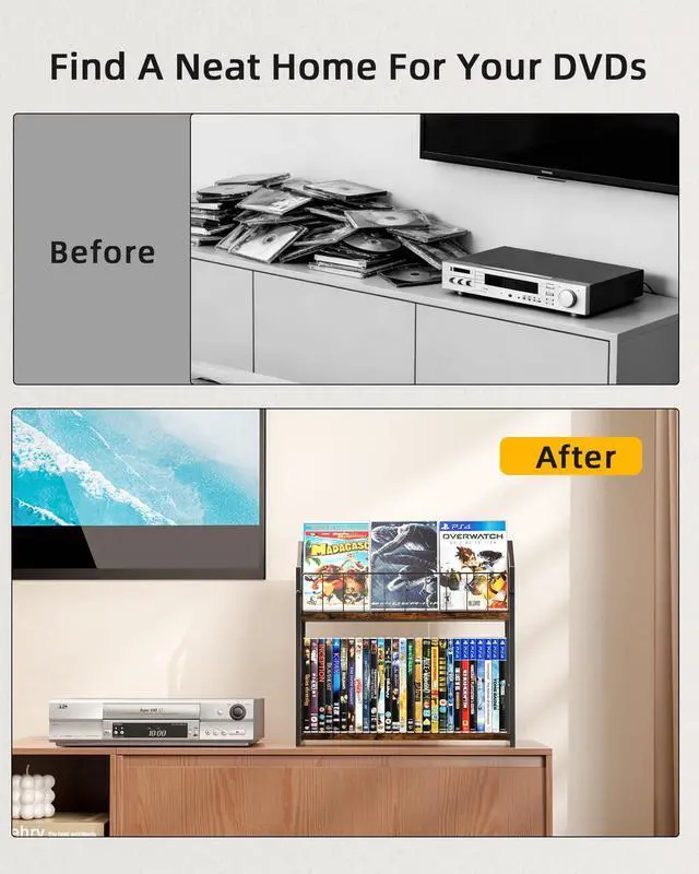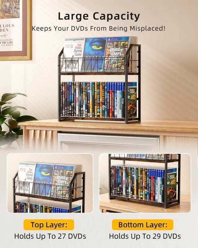 High-Capacity DVD Storage: Our DVD shelf organizes your entire CD and DVD collection with two-tier design. This media storage solution holds 56 DVDs total (29 below, 27 above) and provides reliable support as a sturdy DVD rack and CD holder with 10lb per tier capacity ^^