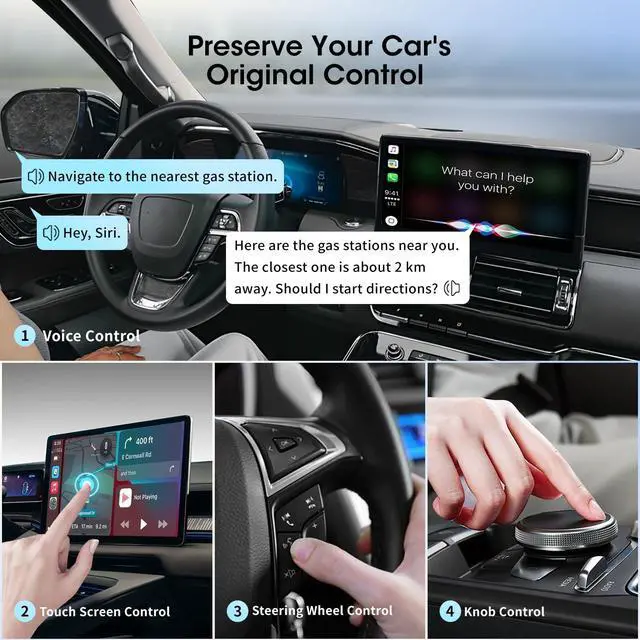 This wireless carplay adapter uses a metal frame + open hole design, with efficient heat dissipation, could keep smooth and unstuck when running apps ^^ Stylish and StableThe mini wireless carplay adapter 65% smaller than similar car play adapters, and the apple carplay is even lighter! Also the carplays wireless design allows you to say goodbye to the messy wired countertops and have a neat interior. Tested 10, 000+ times, the carplay wireless adapter will not fall off though the car shakes violently during driving, which improves the stability of USB interface connection ^^ Multiple Control ItemsThe apple car play wireless adapter retains the four original controls of the car voice assistant, steering wheel, touch screen, and central control button, making your operation safer and more convenient during driving.