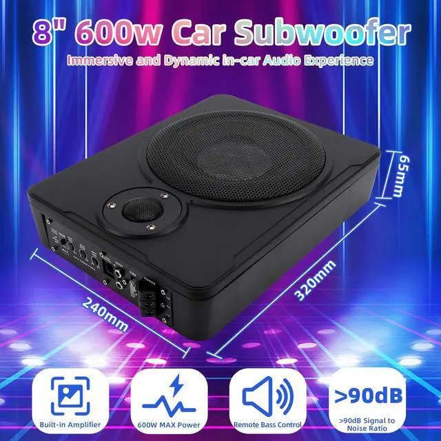The 8 inch under seat subwoofer and amp package has 600 watts of peak power and 200 watts RMS, which has great controls so you can adjust the sound to your liking. PWM MOSFET Power Supply, with amplifier built in, high Level Inputs, adjustable Input Sensitivity and overload protection circuit. ^^ 8-inch woofers, pure low music output, and sound effects. The 2.6" thick subwoofer and amp package is an all in one solution to give you great sounding bass in your vehicle without taking up a lot of space. ^^ Supports High + Low Level Inputs & Remote Controller Compatible with a variety of car stereo audio systems and car head unit equipment.