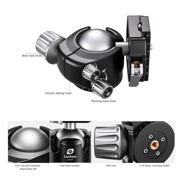 Package Content: 1 x carbon fiber tripod, 1 x lh-47lr lever-release ball head, 1 x ca