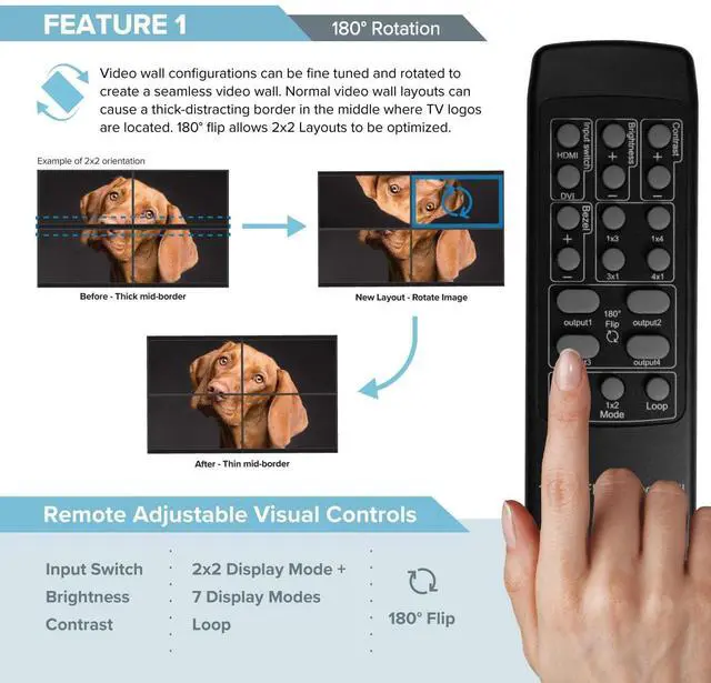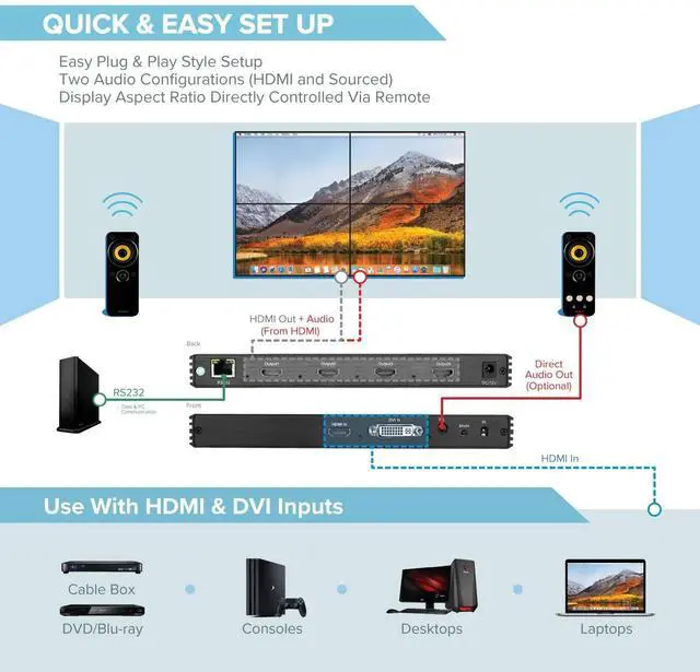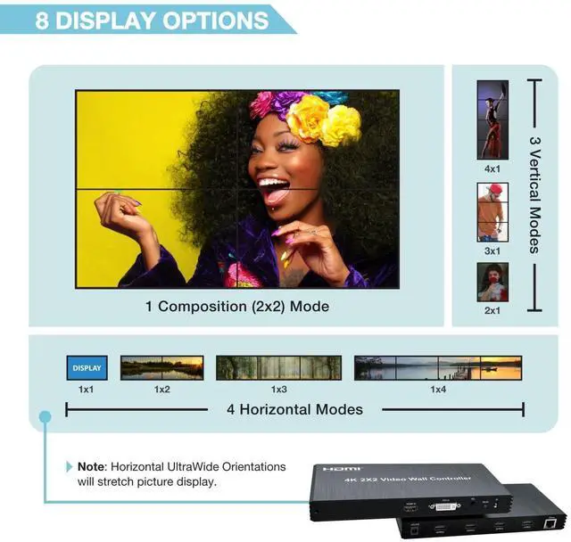 Plug & Play: No driver needed. 180 Image Rotation & Edge Masking supported ^^ 8 Display Modes - 2x2, 1x2, 1x3, 1x4, 2x1, 3x1, 4x1 provide extra diversities on the display options. Cascading Mode - 2x4, 2x8 with additional units. Transmit HDMI signal for up to 100 feet without losing picture quality.