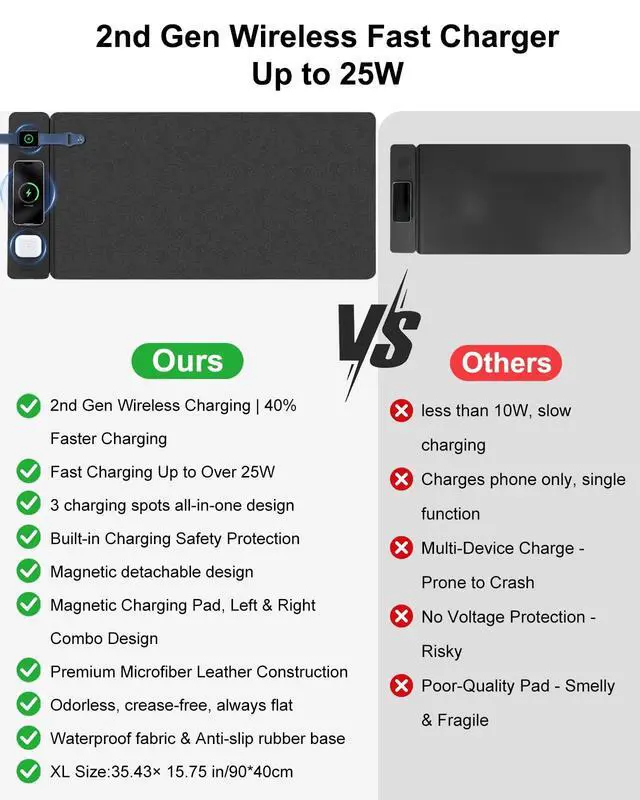 Charging Desk Pad: Elevate Your Workspace QI2 Dual-Port Fast Charging: 40% Efficiency Boost with Comprehensive Safety Protection Say goodbye to the slow charging hassle of QI1 and upgrade to a high-efficiency charging experience. Most wireless chargers on the market only support the QI1 protocol, with a maximum actual charging power of less than 10W. However, the AEOVOLL Desk Pad is equipped with upgraded QI2 dual-port fast charging technology. Even during peak hours when multiple devices are charging simultaneously, it can still stably deliver a high-efficiency power output of 15W a direct 40% increase in charging efficiency compared to traditional QI1 devices. Whether it's an "emergency top-up" before your busy morning commute or "fragmented charging" during meeting breaks, it can quickly recharge your devices, eliminating the need to compromise with long charging waits.