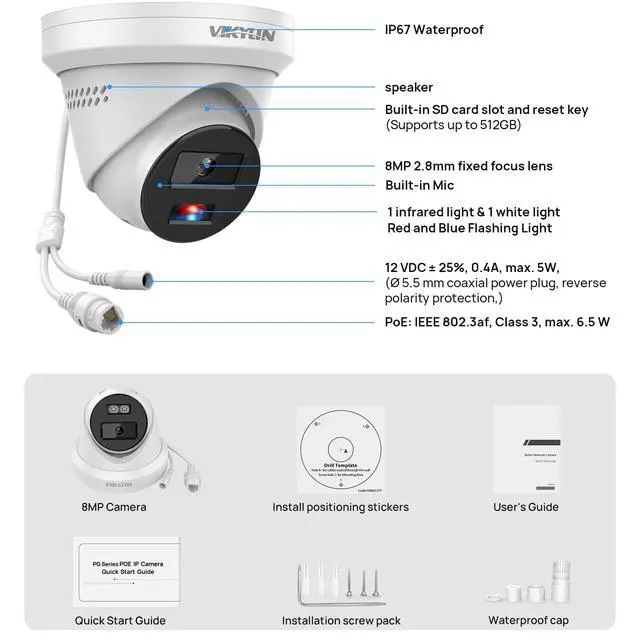 Note: SD slot up to 512G (not included) ^^ Power Over Ethernet & NVR Recording Streamline your setup with PoE tech for effortless installation. A single cable handles a 4K video transmission and provides a consistent power supply to the camera. (Kindly note that a DC adapter is not included); to benefit from PoE convenience, a PoE switch/injector is required. The 8mp PoE ip camera compatible with NVR that supports Open Network Video Interface Forum protocols, and Synology, Blue Iris, Ispy software. ^^ P2P Remote Access, Multi-Platform Log in App works on Android/iOS, P2P Control of 8MP PoE Camera outdoor. You can also use the IP address to view the live feed on web browsers. No monthly fee is needed. H265+ compression allows for maximum encryption with the latest technology as well as backward compatibility with legacy platforms. We value the security of our customers' data, vikylin cameras are trustworthy!