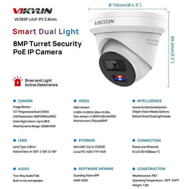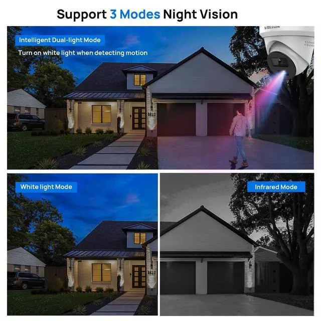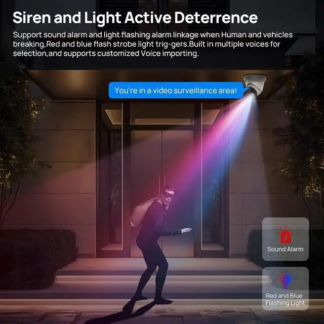 Powerful Active DeterrenceThis poe camera is equipped with red and blue strobe lights, which emit strong warnings when moving objects are detected. The poe ip camera supports two-way talk and can immediately issue customizable audio alerts when suspicious activity is detected. The dual deterrence system of strobe lights and audio alarms can effectively prevent illegal intruders and unwelcome visitors, it is very suitable for use in lanes, doorways, yards, and surrounding areas of houses. ^^ 8MP Ultra HD Smart DualLight Night Vision-- This 4K PoE camera has a resolution of up to 3840x2160, providing clear images and videos.
