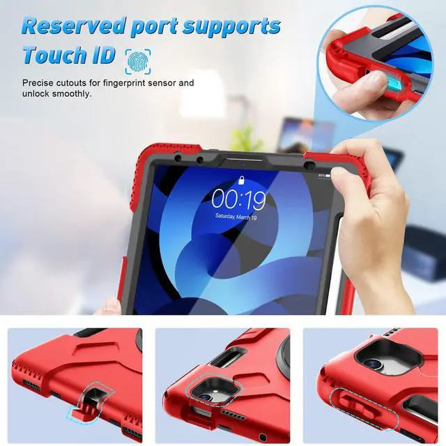 IPAD AIR 5TH GENERATION CASE This case ONLY fits for iPad air 10.9 inch air 5 2022, iPad air 10.9 inch air 4 2020 (Model number: A2588 / A2589 / A2591 / A2072 / A2316 / A2324 / A2325 ), iPad pro 11 inch 4th 2022/ 3rd 2021/ 2nd 2020/ 1st 2018 Please confirm the iPad model before purchase. You can find the model numbers on the back of your iPad with number Axxxx. ^^ SHOCKPROOF PROTECTIVE CASEThis case has passed the military grade drop test: MIL-810G. Three layer shock-absorbing structure provides a perfect protection against accidental drops, bumps and impact. 4 shock-absorbing cushioned corners enhance drop protection. 100% Precise cutout and design allow easy access to all ports, sensors, speakers, cameras. (Screen Protector NOT included). Support Touch ID, precise cutouts space for fingerprint sensor and smooth unlock. ^^ BUILT-IN PENCIL HOLDERUnique design supports Apple pencil (2nd Gen) wireless charging and magnetic attachment without taking off the case. (Apple Pencil NOT included. ) Pencil can be pushed out easily by cutout design in back or absorbed tightly in the slot by magnetic feature. Dont worry lost your Apple pencil any more! ^^ ROTATING STAND + ADJUSTABLE HAND STRAP + PORTABLE SHOULDER STRAP360 degree stand is convenient for vertical / horizontal watching videos, typing and conference. Free your hands! Soft leather fabric Hand strap is adjustable and helps hold the center gravity of your iPad. Nylon cross-body strap can help carrying with a more secure way during hiking, traveling and car seat. Length after fold is 18-30 inch. Perfect choice for active people and outdoor gamer! ^^ SILKY SHOCK-ABSORBING GEL LIQUID SILICONE MATERIALSkin-friendly iPad air 5 case will bring you a different exceptional silky touch feeling and non slippery bumper provides excellent grip.
