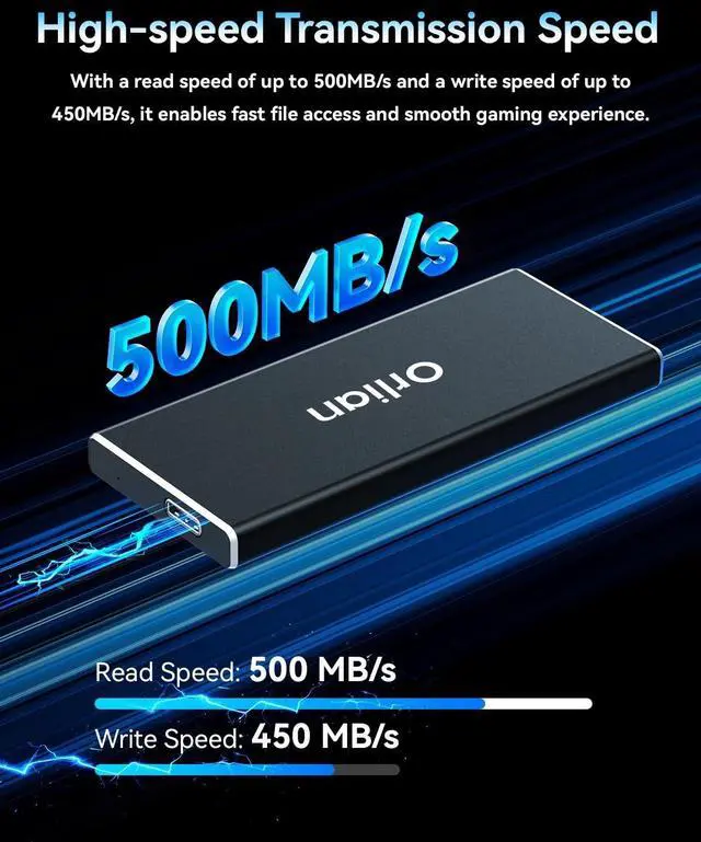 High-speed transmission speed: Equipped with a solid-state drive that supports the USB 3.1 Gen 2 standard, the read speed can reach up to 500MB per second, and the write speed can reach up to 450MB per second, the performance of solid-state drives is much faster.. This enables fast file access and a smooth gaming experience, thereby providing a more efficient and enjoyable usage experience.