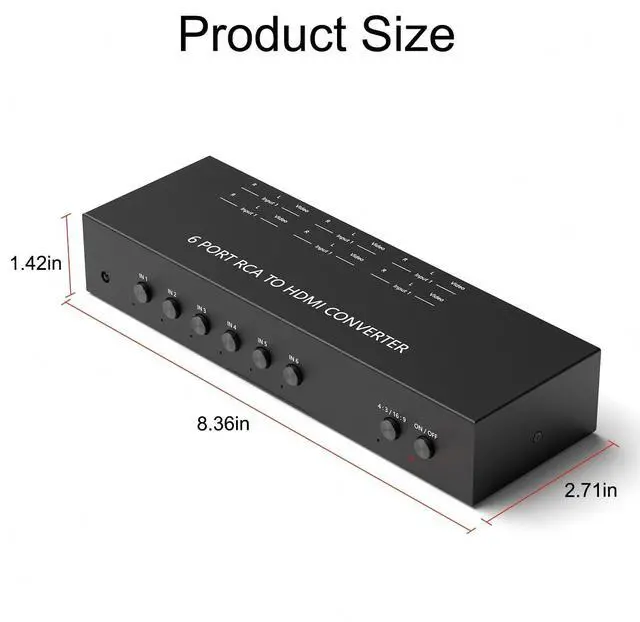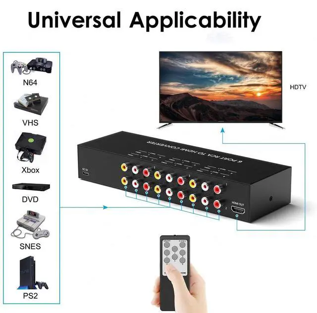Durable aluminum build makes for a longer lifespan. ^^ Universal Applicability. 6 Port AV to HDMI Converter Compatible with Sega, WII, N64, NGC, SNES, PS1, PS2, PS3, Xbox, STB, VHS, VCR DVD Players, TV and Projector, etc. ^^ Please contact the seller's customer service, if you have any questions.