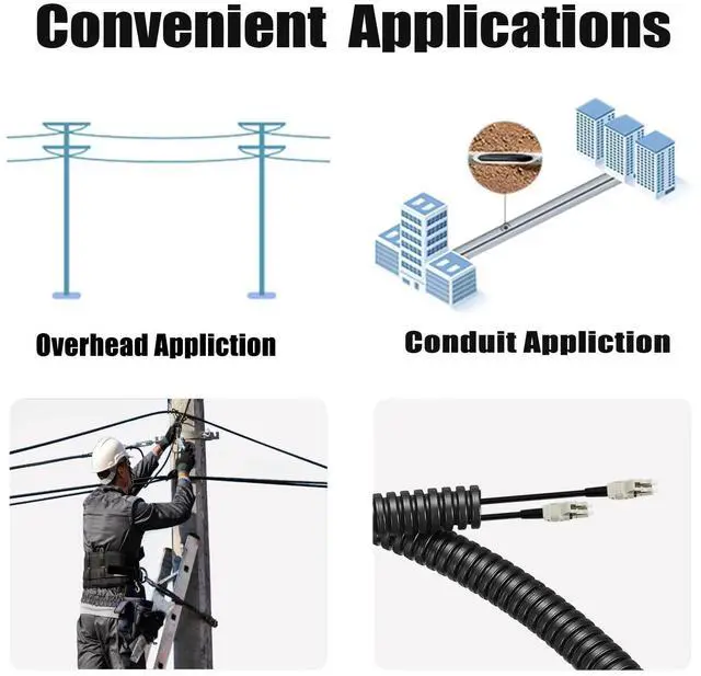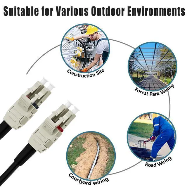 ^^ High-Speed Performance: The OM3 LC to LC outdoor fiber optic cable is designed for high-speed data transmission, supporting bandwidths of up to 100 Gbps, making it ideal for applications such as data centers, enterprise networks, and telecommunication systems. It offers versatile installation options, including overhead installation or routing through conduits.