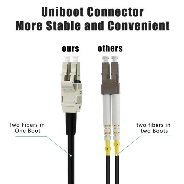 ^^ Space-saving Uniboot Connectors: Our LC duplex connector with uniboot is encased in a common housing with one boot, terminating on a single twin-fiber round cable. By using cable assemblies with LC Uniboot connectors, half of the space can be saved over traditional duplex cable. Uniboot single jacket patch cables make patch panel cable management considerably easier.