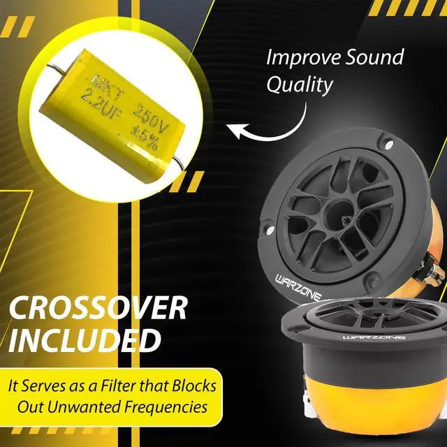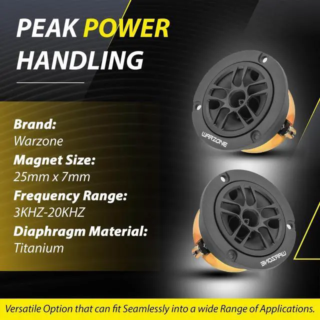 Elevate your audio experience with the Warzone WZ30TW super tweeter speaker, designed for those who demand the best in sound quality. This 2.94 -inch tweeter boasts a nominal impedance of 4 ohms and a maximum power capacity of 650 watts, delivering powerful and dynamic audio performance. With a sensitivity of 103dB, the WZ30TW ensures every detail of your audio is captured with exceptional clarity. The titanium diaphragm and CCAW voice coil enhance both durability and sound fidelity, while the frequency range of 3KHz to 20KHz provides precise sound reproduction across a wide spectrum.