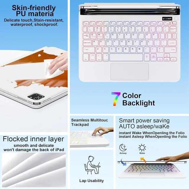 Rechargeable Battery: 7-Color Backlit Keyboard Case for iPad Pro 13 inch (M4) 2024From dawn to dusk, adapt effortlessly! Adjusting 7 backlight and 3 levels of brightness ensures clear visuals in every setting, enhancing your immersive experience. ^^ Ultimate Typing EaseEnjoy a refined typing experience with advanced scissor-switch keys that respond to even a light touchactuating halfway for smooth, quiet entry with no missed keystrokes. A full row of dedicated shortcut keys puts media playback, volume, and screen controls at your fingertips. Type comfortably and efficiently, enhancing your workflow wherever you go! ^^ Auto Wake/Sleep Function & Slim Protection Automatically wakes or sleeps the tablet when opening/closing the case, conserving battery life. The folio design provides full front and back protection while maintaining a slim profile for portability. ^^ Lifetime Technical Support Backed by lifetime technical assistance. Includes a Bluetooth keyboard, type-C cable, quick-start guide, and detailed manual for seamless setup.