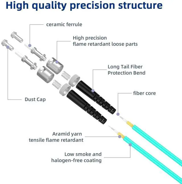 High performance and stabilityThe multimode duplex fiber patch cable is premium ceramic insert core and high quality fiber coreHigh precision, high stability, and wear resistance,high performance.Low insertion loss(0.3dB),high return loss(50dB),low attenuation,providing precise alignment to ensure signal integrity.Transmission is both high-speed and stable.50/125mgood interchangeability.The fiber with dust cap,effectively protect interfaces and ensure product good performance