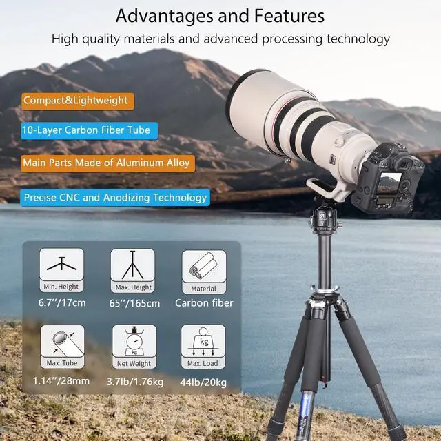 Rock SolidThis carbon fiber tripod uses 10 layers of 100% carbon fiber with 1.1" / 28mm diameter legs, its main body is made of aviation aluminum alloy through CNC processing, So it can support 45 pounds, and is very strong and stable. Also comes with handy hook for additional weight stability.