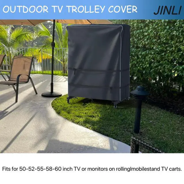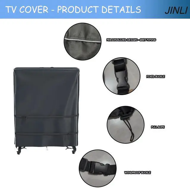 ^^ Windproof design: Adjustable drawstring to ensure a tight fit between your TV and the mobile trolley. Four bottom buckles firmly fix the cover to the base of the trolley to prevent it from being blown away by the wind. The buckle straps on both sides tighten the excess part of the cover, making it fit more closely to your TV display trolley.