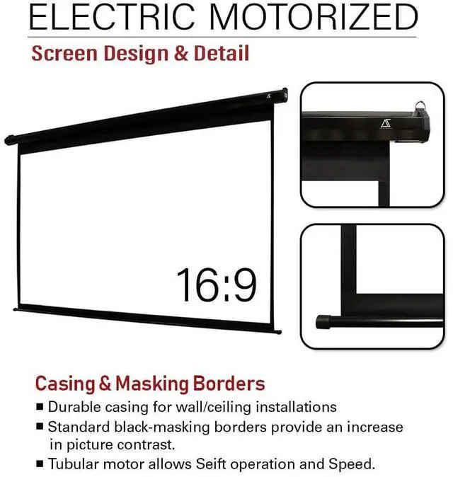 Easy Installation & Maintenance: Ships fully assembled and plug-and-play ready for quick wall or ceiling mounting. The drop-down projector screen motorized design ensures smooth operation, while the tubular motor allows swift operation and higher speed. The screen surface is easy to clean with mild soap and water. ^^ Motorized Control &