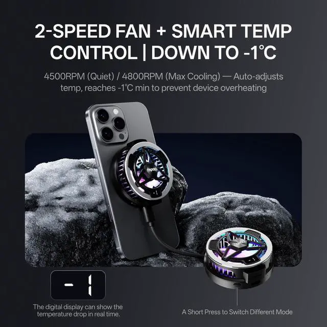 Simple, High-Performance All-in-One Phone CoolingAdapts the latest semiconductor cooling technology, which delivers stronger cooling effects (as low as -1 degree Celsius) that helps your phone reach its full potential. ^^ Efficient, Low-Noise Cooling FanThe 4800RPM fan delivers powerful airflow with excellent cooling performance while keeping noise to a whisper-quiet level, ensuring smooth gameplay and fluid streaming. ^^ Prevent Performance Throttling and Protect Battery HealthFeaturing an outstanding sub-zero cooling effect, MC05 can keep you phone running at peak performance, preventing unexpected lags, frame drops or shutdowns caused by overheating during intensive gaming, live streaming or 4K recording.