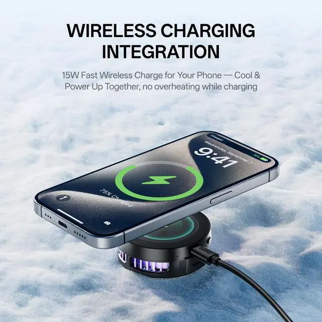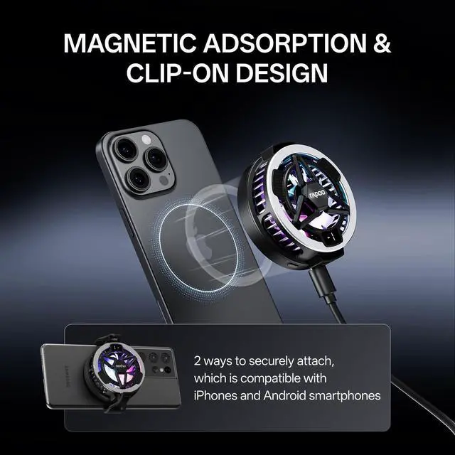 Whats more, reducing your battery aging speed in long-term use. ^^ 15W Magsafe Wireless ChargingCompatible with iPhone 12, 13, 14, 15, 16, 17 and future models with Magsafe, this phone cooler provides 15W fast wireless charging to relieve your battery anxiety, and extends your battery lifespan by slowing down its aging speed with optimized battery levels. ^^ Wide CompatibilityComes with 2 detachable clips, offering an additional clip-on option for devices that do not have Magsafe feature. Say goodbye to compatibility issues of magnetic phone coolers.