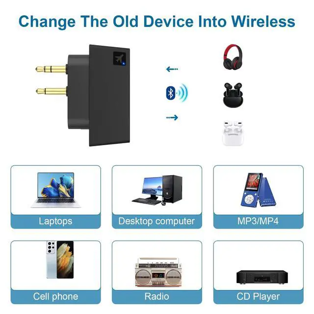Airplane adapter for wireless/wired headphones, fits for any 3.5 mm aux jack on airplane, home, gym, boats or in car, foldable single/double gold plated. (Make sure the scene you are using comes with a 3.5 mm aux jack) ^^ Airplane bluetooth adapter compatible with Bose QuietComfort QC45 QC35 QC35ii QC30 NC700 SoundLink SoundSport and Sony WH-1000XM5, WH-1000XM4, WH-1000XM3, WH-ch510, WH-ch710n, WH-ch700n wireless headset. ^^ Bluetooth 5.3 transmitter receiver brings more stable signal transmission, enjoy music without a headphone cable through the airplane wireless adapter. ^^ Package include airplane bluetooth adapter *1, Type-C charging cable *1, user manual *1, Portable bag*1, if you need help or replacement, please contact us by email first.