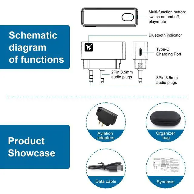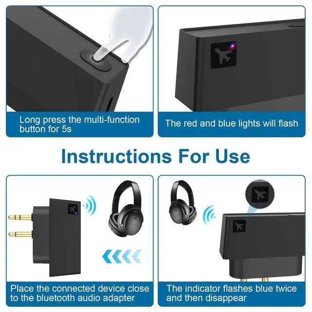 Tips: Bluetooth 5.3 transmitter receiver connection is very simple, open the headset Bluetooth and aviation adapter Bluetooth, close together will be automatically connected, according to the flashing light to confirm whether the match is complete.