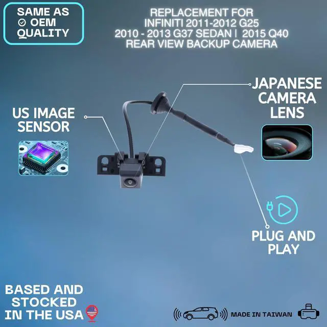 {Plug and Play} This device can be easily plugged into the existing OEM video harness. ^^ {Replaces} Backup Camera Compatiable with Infiniti 2011-2012 G25 ^^ 2010-2013 G37 Sedan ^^ 2015 Q40 ^^ {OEM#} 28442-1NF0B, 28442-1NF0A (284421NF0B, 284421NF0A) ^^ {Specs} *Angle: 170 Degrees *Waterproof Level: IP68 *Resolution: 600 TV lines *Pixel: 728 x 582 *Signal: NTSC/PAL * Illumination: 0.1 Lux light (minimum) *Power: DC 12V * Cable: 15 inches ^^ {Important note} We recommend contacting your local dealer to confirm that the part number you are purchasing is an exact match for the part number you require, prior to making your purchase.