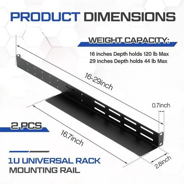 blackSize: about 16-29 inches adjustable depthPackage includes: 1 Set of 1U universal rack mount railsNotes: Manual measurement, please allow slight errors on size. The color may exist a slight difference due to different screen displays