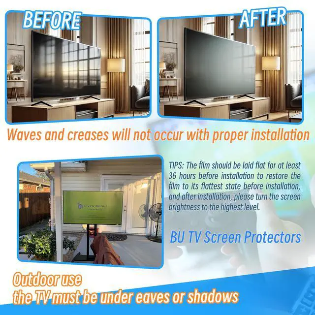 Clear Vision: This anti-glare TV screen film is designed with a matte coating that dramatically reduces indoor and outdoor TV screen reflections and glare ^^ Outdoor Glare Usage TipWhile the outdoor TV anti-glare shield performs exceptionally in reducing glare, direct sunlight on the TV screen may temporarily diminish its anti-glare function. Ensure your TV is placed under a roof or in a shaded area, after installation adjust the screen brightness to the maximum for the best results and consistent glare reduction ^^ Blue Light Filter for Eye ProtectionThis TV anti-glare screen protector features a built-in blue light filter, reducing blue light 380nm to 495nm. It helps alleviate eye strain and promotes better sleep, Suitable for prolonged TV viewing ^^ TV Matte Film for ProtectionIn addition to reducing glare, the matte finish provides a protective layer to the TV screen against scratches, fingerprints and everyday wear and tear, keeping the TV screen clean and ensuring it stays in good condition.