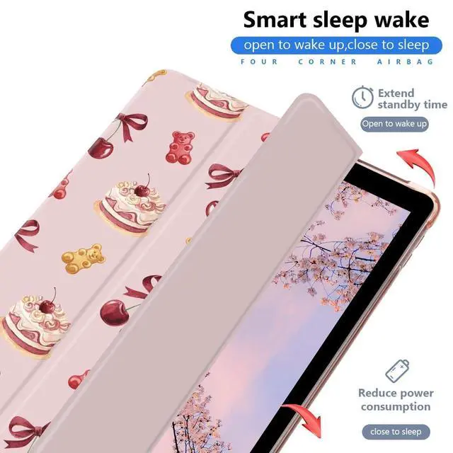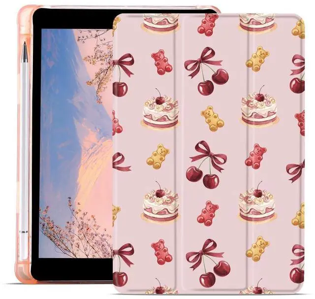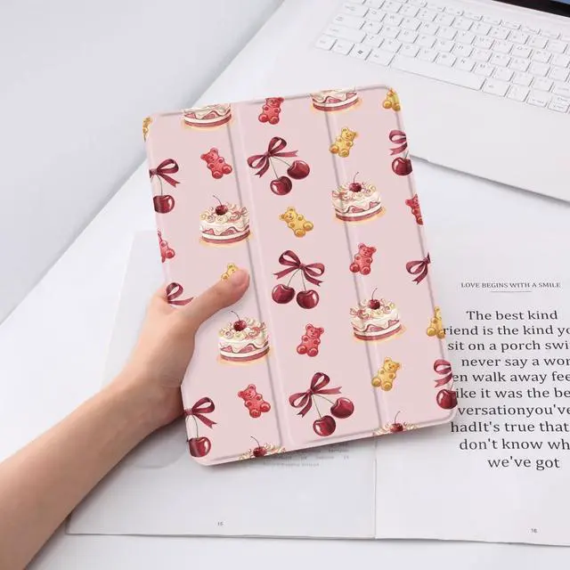 AdorableWhimsy Cute Cherry Case for iPad (A16) 11th Gen 2025 11" / iPad 10th Generation 2022 10.9" with Pencil Holder Sweet Desserts Aesthetic Girly Case Foldable Pink Leather Protective Cover