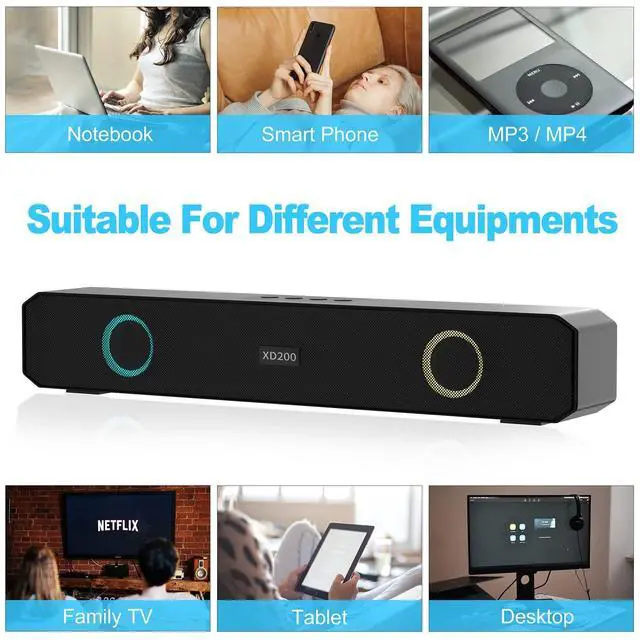[Atmosphere Light]: The portable sound bar have LED lights providing atmosphere while watching
