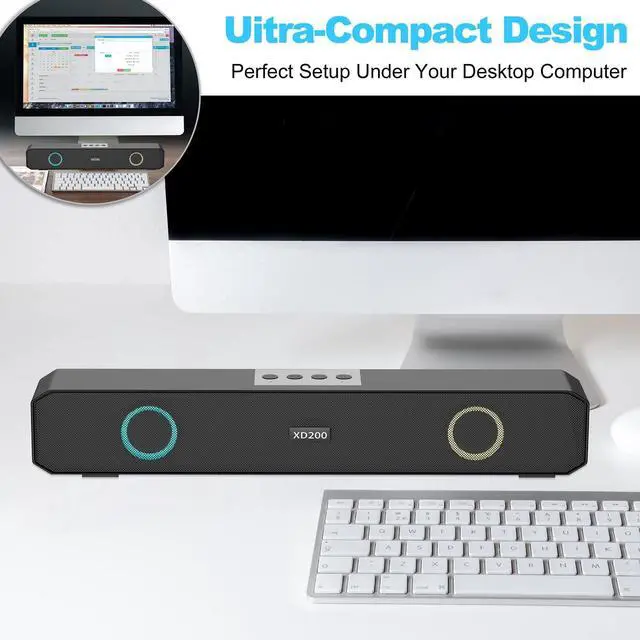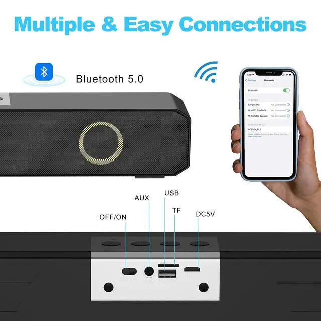 [Multiple & Easy Connections]: The sound bar support multiple connections, such as bluetooth connection and AUX jack cable connetion, also with buttons to help open music or movie journey. Effortlessly connect your device to these speakers via Bluetooth for a audio streaming experience. The Bluetooth computer speakers are compatible with a wide range of devices, including laptops, tablets, smartphones, and more.