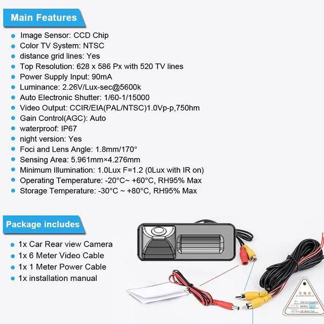 Content: 1 x Car CCD Camera1 x 6M video cable1 x 1M power cable1 x User Manual