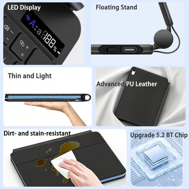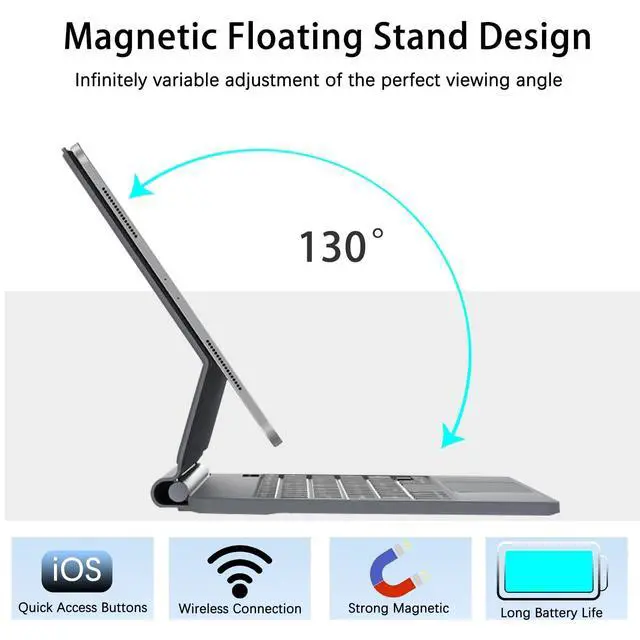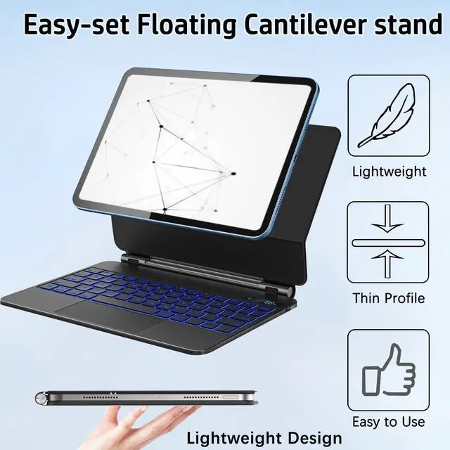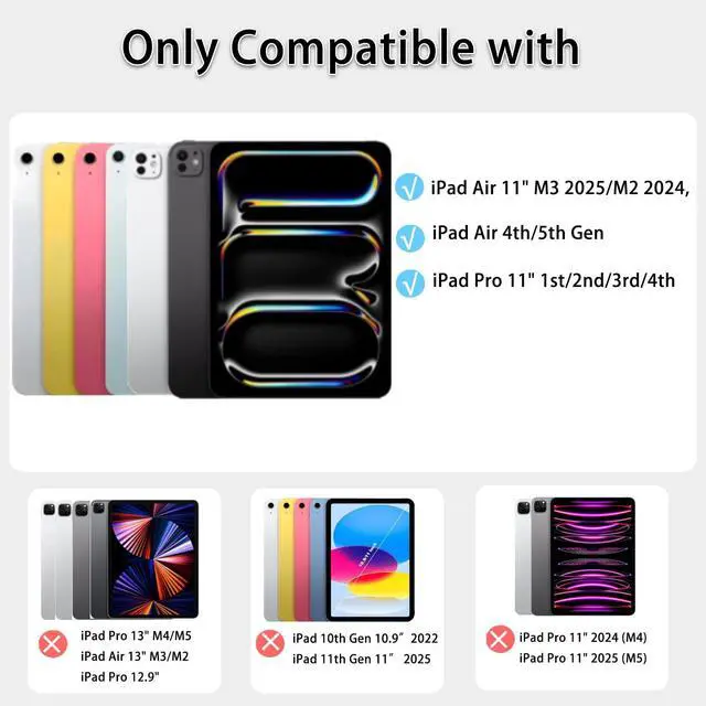 CompatibilityThis detachable keyboard case is designed exclusively for iPad Air 11" M3 2025/M2 2024 & iPad Air 4th/5th 10.9", iPad Pro 11" (1st/2nd/3rd/4th). The models are A3266, A3267, A3270, A2902, A2903, A2904, A2759, A2435, A2761, A2762, A2377, A2459, A2301, A2460, A2228, A2068, A2230, A2231, A1980, A2013, A1934, A1979, A2588, A2589, A2591, A2316, A2324, A2325, A2072 Please verify your device model before ordering to ensure perfect fit. ^^ Quick-set Magnetic Stand The floating magnetically stand elevates your 10.9 -11" iPad Air or 11" iPad Pro for a more laptop-style setup, which transforms your tablet into a laptop-style workst or study sessions.