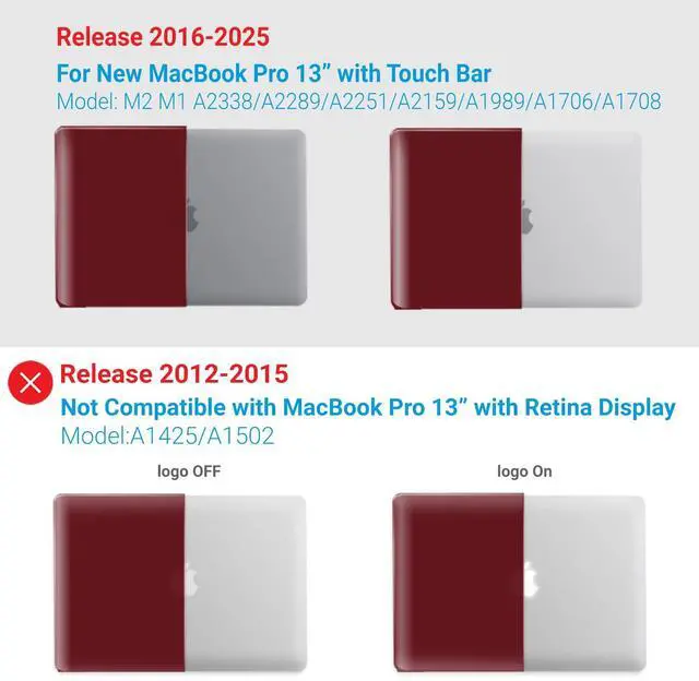 Incompatible Models: Please note that this case is not compatible with older MacBook Pro 13 inch models with Retina Display released before 2016, as well as MacBook Air 13 inch models. We kindly ask you to check the model number located at the bottom of your laptop to ensure proper fit.