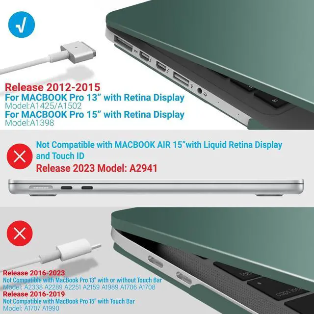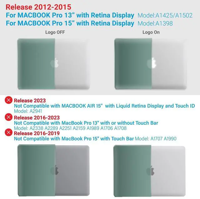 Compatibility- For Macbook Pro 15 inch with Retina Display Model A1398 MC975LL/A or MC976LL/A or ME293LL/A or ME294LL/A ^^ Lightweight & Sturdy Compatible with Macbook Pro 15 Inch Case A1398 -Made of sturdy lightweight plastic, our protective case for MacBook Pro 15 Inch protects your Macbook Pro 15 from scratches and dings. At only 10 oz, it doesn't add any noticeable weight to your MacBook 15 Pro. ^^ Easy Installation & Removal Case For Macbook Pro 15 Case A1398 - Our protective case has micro clips that securely fastens to your MacBook, and snaps off with easy when needed.