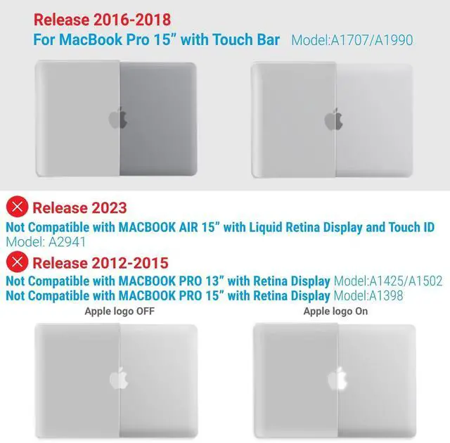 • Incompatible Models: This case is not compatible with the New M2 MacBook Air 15" (model A2941) released in 2023 and MacBook Pro 15" with Retina Display (models A1398) released in 2015, 2014, 2013, and 2012. Please check the model number located at the bottom of your laptop before making your purchase decision for the perfect fit.