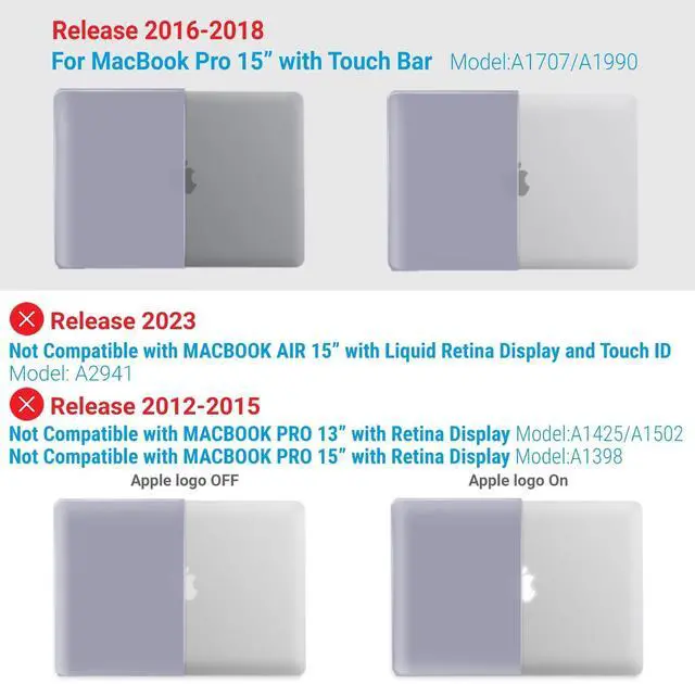 • Check Your Model: Exclusively designed for the Macbook Pro 15 Inch with Touch Bar & Touch ID released in 2019 2018 2017 2016; Models: A1990/A1707; Release 2019 MV902LL/A, MV922LL/A, MV912LL/A, MV932LL/A and 2018 -- MR932LL/A, MR942LL/A -- and 2017 -- MPTR2LL/A, MPTU2LL/A, MPTT2LL/A, MPTV2LL/A -- Release 2016 -- MLH32LL/A , MLW72LL/A, MLH42LL/A, MLW82LL/A).