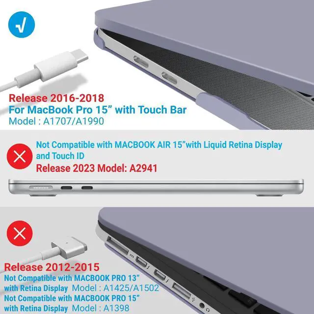 • Incompatible Models: This case is not compatible with the New M2 MacBook Air 15" (model A2941) released in 2023 and MacBook Pro 15" with Retina Display (models A1398) released in 2015, 2014, 2013, and 2012. Please check the model number located at the bottom of your laptop before making your purchase decision for the perfect fit.