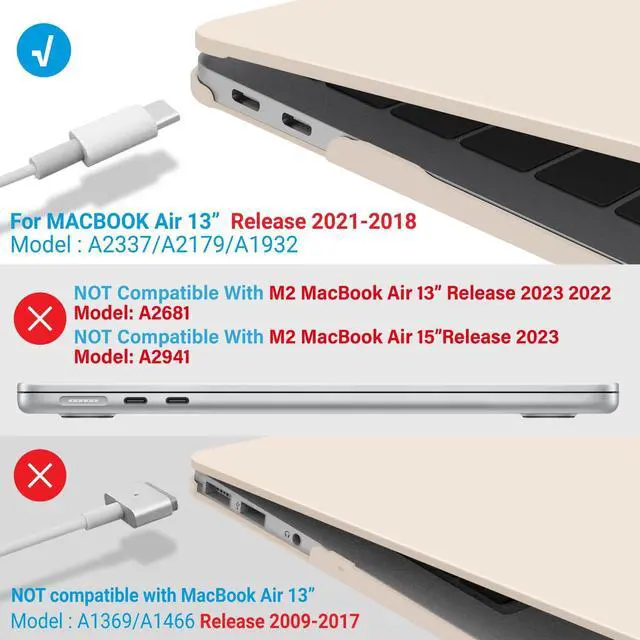 • Incompatible Models: Please note that this case does not fit the 2022 M2 MacBook Air 13 Inch; Model: A2681 and Older MacBook Air 13 Released BEFORE 2018; Models: A1466/A1369. Make sure to check the model number at the bottom of your laptop A****.