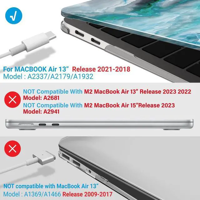 • Incompatible Models: Please note that this case does not fit the 2022 M2 MacBook Air 13 Inch; Model: A2681 and Older MacBook Air 13 Released BEFORE 2018; Models: A1466/A1369. Make sure to check the model number at the bottom of your laptop A****.