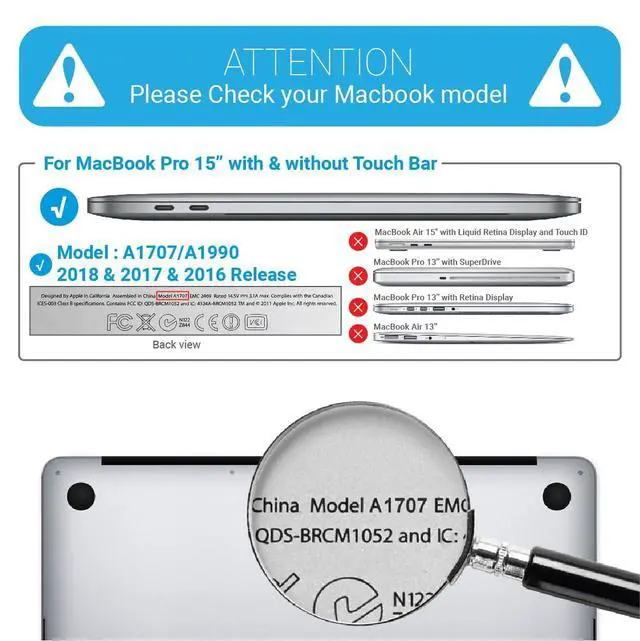 • Check Your Model: Exclusively designed for the Macbook Pro 15 Inch with Touch Bar & Touch ID released in 2019 2018 2017 2016; Models: A1990/A1707; Release 2019 MV902LL/A, MV922LL/A, MV912LL/A, MV932LL/A and 2018 -- MR932LL/A, MR942LL/A -- and 2017 -- MPTR2LL/A, MPTU2LL/A, MPTT2LL/A, MPTV2LL/A -- Release 2016 -- MLH32LL/A , MLW72LL/A, MLH42LL/A, MLW82LL/A).
