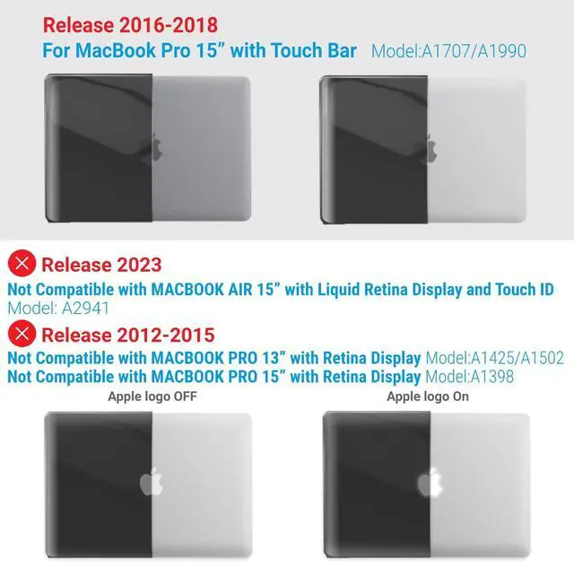 • Incompatible Models: This case is not compatible with the New M2 MacBook Air 15" (model A2941) released in 2023 and MacBook Pro 15" with Retina Display (models A1398) released in 2015, 2014, 2013, and 2012. Please check the model number located at the bottom of your laptop before making your purchase decision for the perfect fit.