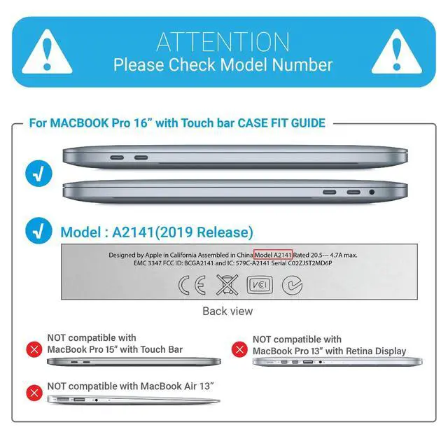 • Incompatible Models: This particular case is NOT compatible with the New MacBook Pro 16" models released in 2021, 2022, and 2023, specifically the models with the model numbers M2 A2780 and M1 A2485. To ensure the perfect fit, we kindly request you to check the model number located at the bottom of your laptop before making your purchase decision.