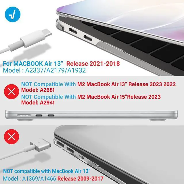 • Incompatible Models: Please note that this case does not fit the 2022 M2 MacBook Air 13 Inch; Model: A2681 and Older MacBook Air 13 Released BEFORE 2018; Models: A1466/A1369. Make sure to check the model number at the bottom of your laptop A****.