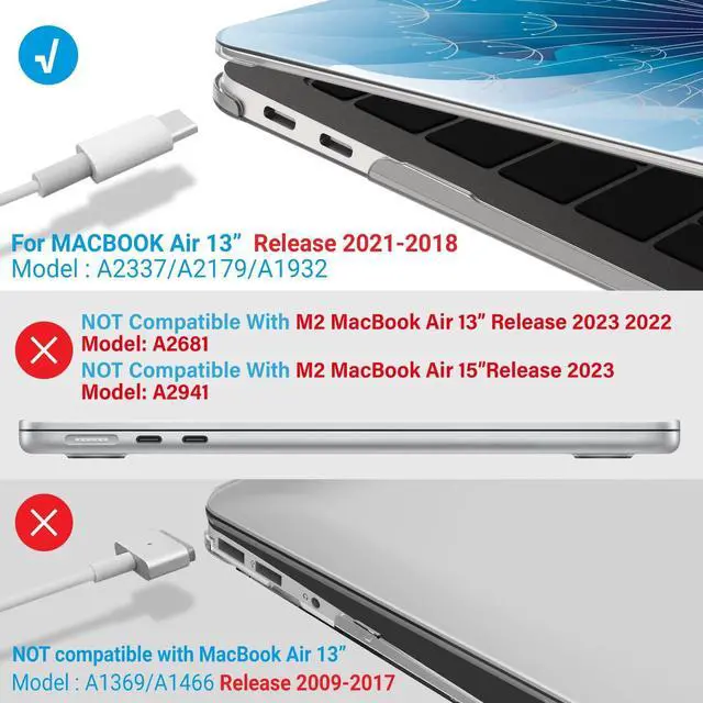 • Incompatible Models: Please note that this case does not fit the 2022 M2 MacBook Air 13 Inch; Model: A2681 and Older MacBook Air 13 Released BEFORE 2018; Models: A1466/A1369. Make sure to check the model number at the bottom of your laptop A****.