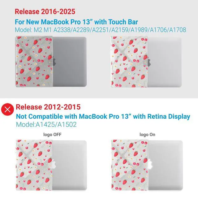 • Incompatible Models: Please note that this case is not compatible with older MacBook Pro 13 inch models with Retina Display released before 2016, as well as MacBook Air 13 inch models. We kindly ask you to check the model number located at the bottom of your laptop to ensure proper fit.