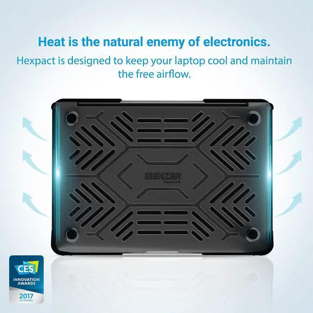 ^^ Fully Vented - The iBenzers Hexpact protective case for Macbook Air 11 has cut out vents that facilitates better heat disbursement. It also has rubberized corner stands that acts to separate the bottom of your laptop from the surface it's on. This few inches of separation further enhances airflow and heat distribution. ^^ 360 Degrees Protection - With its hard outer shell, soft impact resistant rubber bumpers and bottom skid pads, our unique Macbook Air 11 inch protective case design are meant to provide 360 degrees of protection for your laptop from everyday drops, knocks and shock.
