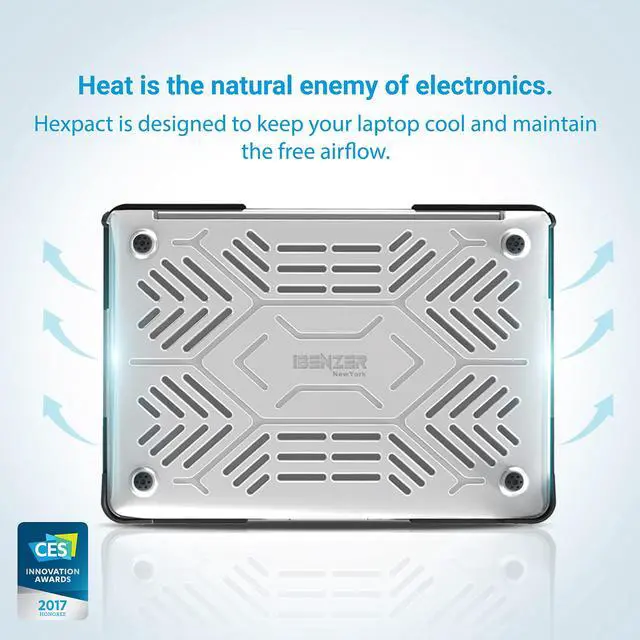 ^^ Fully Vented - The iBenzers Hexpact protective case for Macbook Air 11 has cut out vents that facilitates better heat disbursement. It also has rubberized corner stands that acts to separate the bottom of your laptop from the surface it's on. This few inches of separation further enhances airflow and heat distribution. ^^ 360 Degrees Protection - With its hard outer shell, soft impact resistant rubber bumpers and bottom skid pads, our unique Macbook Air 11 inch protective case design are meant to provide 360 degrees of protection for your laptop from everyday drops, knocks and shock.