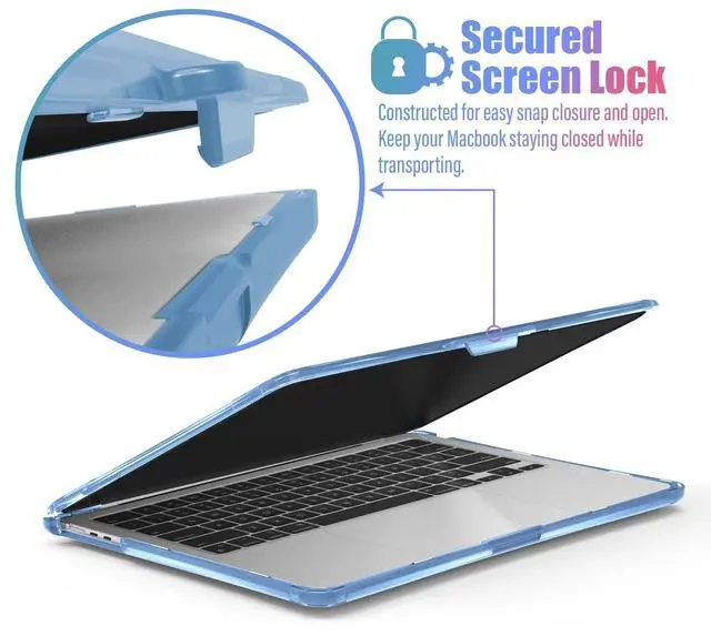 Screen Lock: With its hard outer shell, soft impact resistant rubber bumpers, bottom skid pads, and screen lock, our unique protective case design is meant to provide 360 degrees of protection for your laptop from everyday drops, knocks and shock.