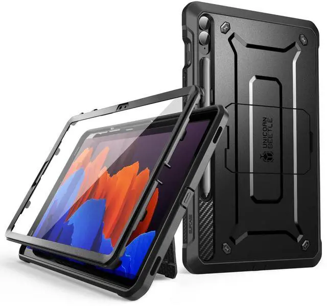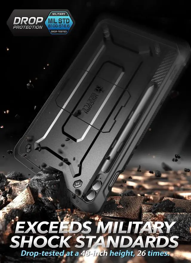 Built-in screen protector and class-leading drop protection and raised edges to protect screen and camera. ^^ Functional pop out kickstand allows easy access to your favorite shows, movies, and games while on the go. ^^ Built-in pen slot allows you to carry S Pen anywhere. ^^ Shock-resistant, multi-layered case with PC hard shell and flexible TPU provides protection against accidental drops, bumps and impact. ^^ Compatible with Samsung Galaxy Tab S9 FE Plus 12.4 inch (2023).