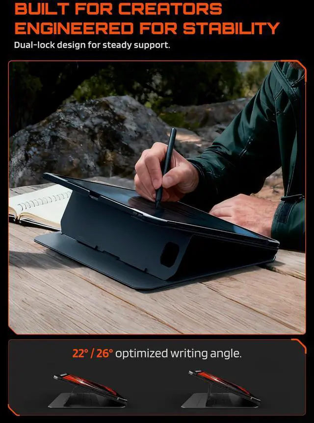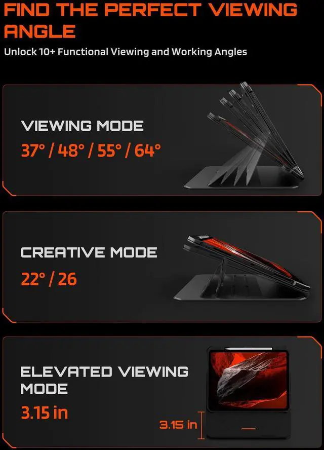 Modes]: 6 adjustable angles for multiple scenarios, including 2 writing angles (2226) ideal for drawing and note-taking, and 4 viewing angles (3764) for watching videos, video calls, and working. The magnetic structure provides stable support and allows seamless switching between landscape and portrait modes.