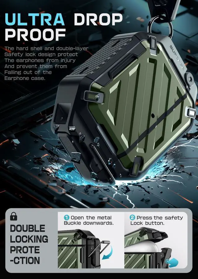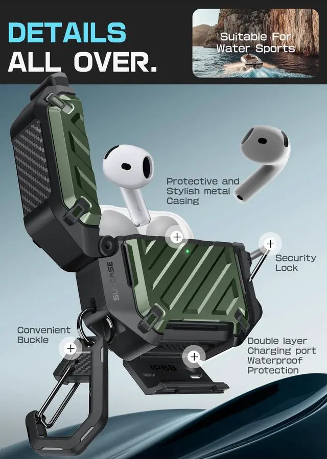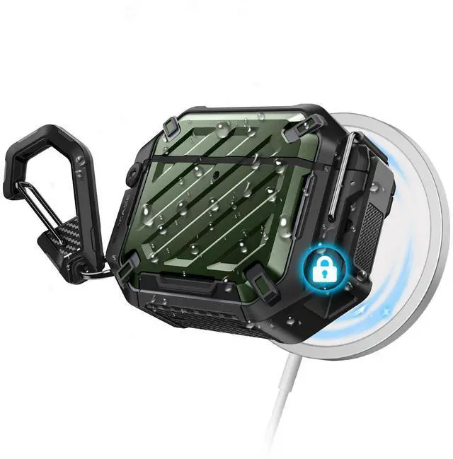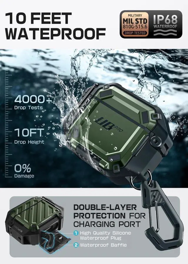 Please Note: AirPods and Charging device / MagSafe are NOT included. ^^ Precise cutouts provide easy access to your USB cable port and front LED is visible while charging. ^^ Carabiner Design protects your AirPods from getting lost, just clip to your belt loop or backpack and go. ^^ Double locks design in the charge port and the connection armors your airpods adhering to IP68 waterproof level of 10 feet. ^^ Solid hard-shell TPU and PC materials provide military grade protection against drops and falls. Extra internal soft rubber cover guard your airpods from wear and tear.